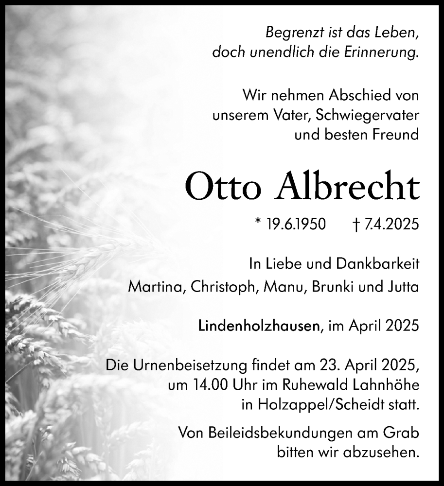 Hier finden Sie alle Traueranzeigen aus der Zeitung, die bisher für Otto Albrecht erschienen sind. Weitere Traueranzeigen, die in der Zeitung erscheinen, werden hier ebenfalls aufgelistet