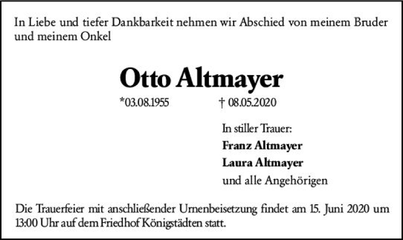 Hier finden Sie alle Traueranzeigen aus der Zeitung, die bisher für Otto Altmayer erschienen sind. Weitere Traueranzeigen, die in der Zeitung erscheinen, werden hier ebenfalls aufgelistet