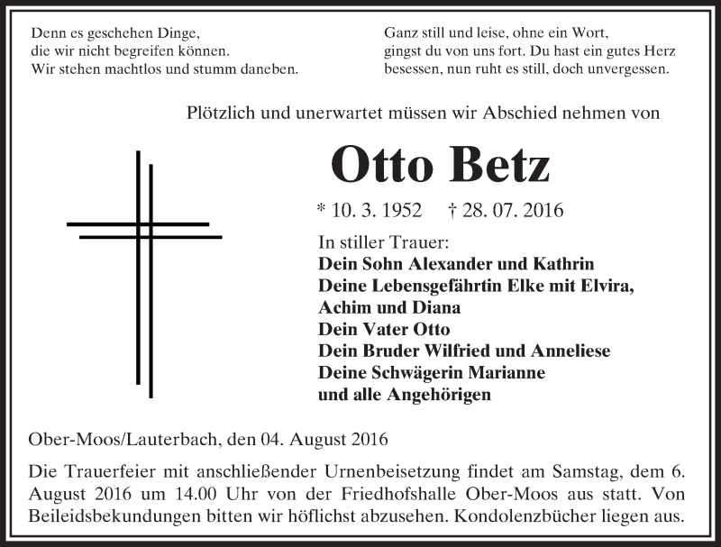 Hier finden Sie alle Traueranzeigen aus der Zeitung, die bisher für Otto Betz erschienen sind. Weitere Traueranzeigen, die in der Zeitung erscheinen, werden hier ebenfalls aufgelistet