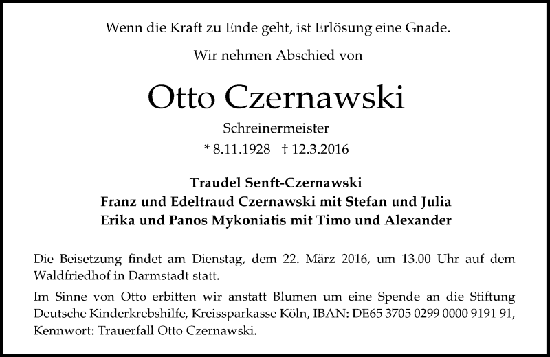 Hier finden Sie alle Traueranzeigen aus der Zeitung, die bisher für Otto Czernawski erschienen sind. Weitere Traueranzeigen, die in der Zeitung erscheinen, werden hier ebenfalls aufgelistet