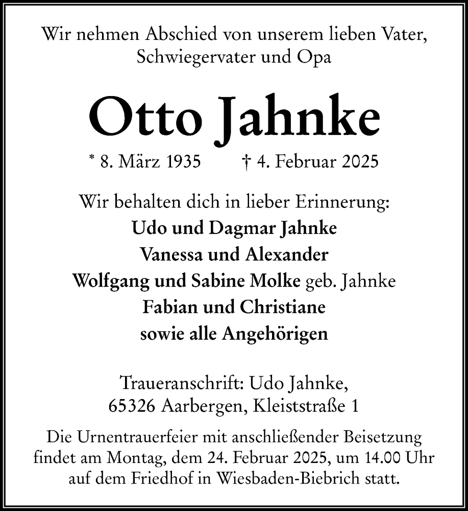 Hier finden Sie alle Traueranzeigen aus der Zeitung, die bisher für Otto Jahnke erschienen sind. Weitere Traueranzeigen, die in der Zeitung erscheinen, werden hier ebenfalls aufgelistet