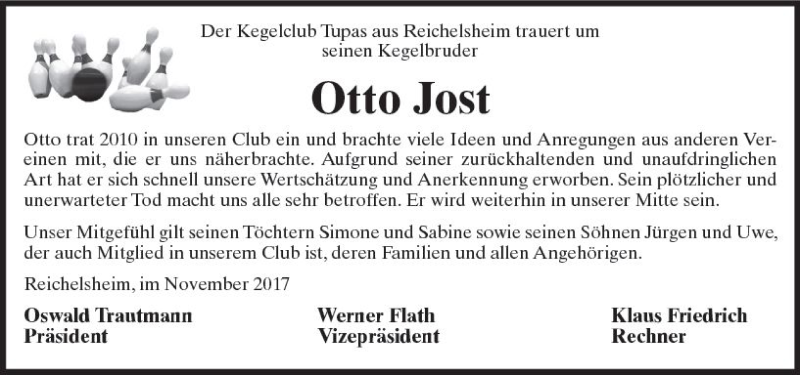 Hier finden Sie alle Traueranzeigen aus der Zeitung, die bisher für Otto Jost erschienen sind. Weitere Traueranzeigen, die in der Zeitung erscheinen, werden hier ebenfalls aufgelistet