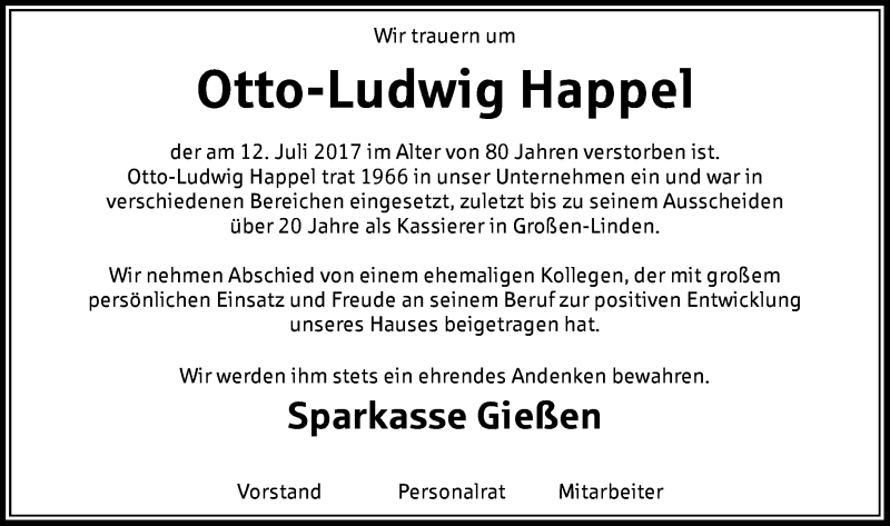 Hier finden Sie alle Traueranzeigen aus der Zeitung, die bisher für Otto-Ludwig Happel erschienen sind. Weitere Traueranzeigen, die in der Zeitung erscheinen, werden hier ebenfalls aufgelistet