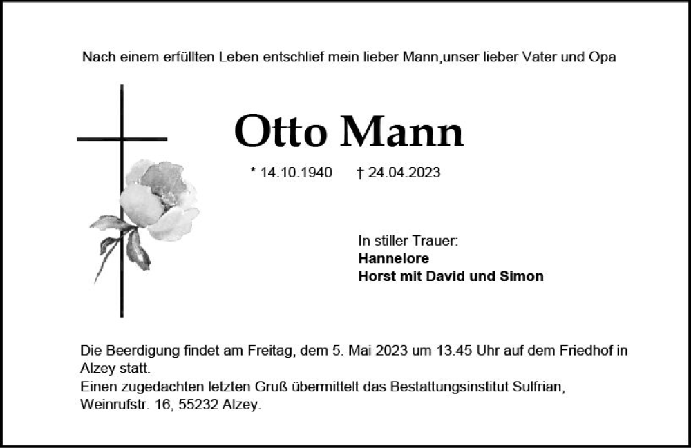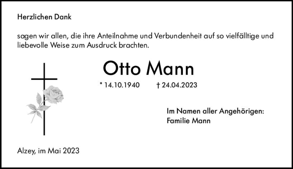 Hier finden Sie alle Traueranzeigen aus der Zeitung, die bisher für Otto Mann erschienen sind. Weitere Traueranzeigen, die in der Zeitung erscheinen, werden hier ebenfalls aufgelistet