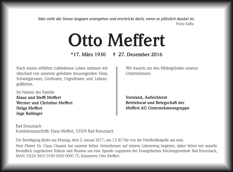 Hier finden Sie alle Traueranzeigen aus der Zeitung, die bisher für Otto Meffert erschienen sind. Weitere Traueranzeigen, die in der Zeitung erscheinen, werden hier ebenfalls aufgelistet