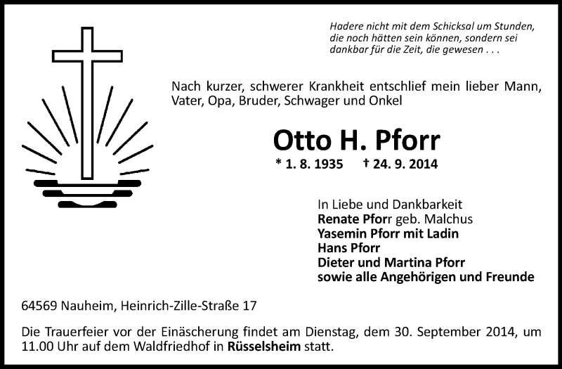 Hier finden Sie alle Traueranzeigen aus der Zeitung, die bisher für Otto Pforr erschienen sind. Weitere Traueranzeigen, die in der Zeitung erscheinen, werden hier ebenfalls aufgelistet