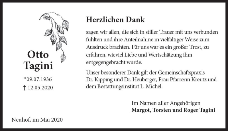 Hier finden Sie alle Traueranzeigen aus der Zeitung, die bisher für Otto Tagini erschienen sind. Weitere Traueranzeigen, die in der Zeitung erscheinen, werden hier ebenfalls aufgelistet