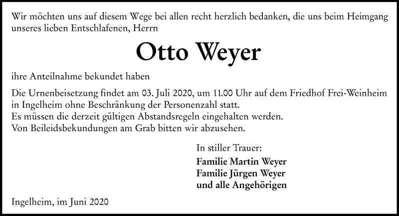 Hier finden Sie alle Traueranzeigen aus der Zeitung, die bisher für Otto Weyer erschienen sind. Weitere Traueranzeigen, die in der Zeitung erscheinen, werden hier ebenfalls aufgelistet