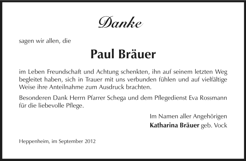 Hier finden Sie alle Traueranzeigen aus der Zeitung, die bisher für Paul Bräuer erschienen sind. Weitere Traueranzeigen, die in der Zeitung erscheinen, werden hier ebenfalls aufgelistet