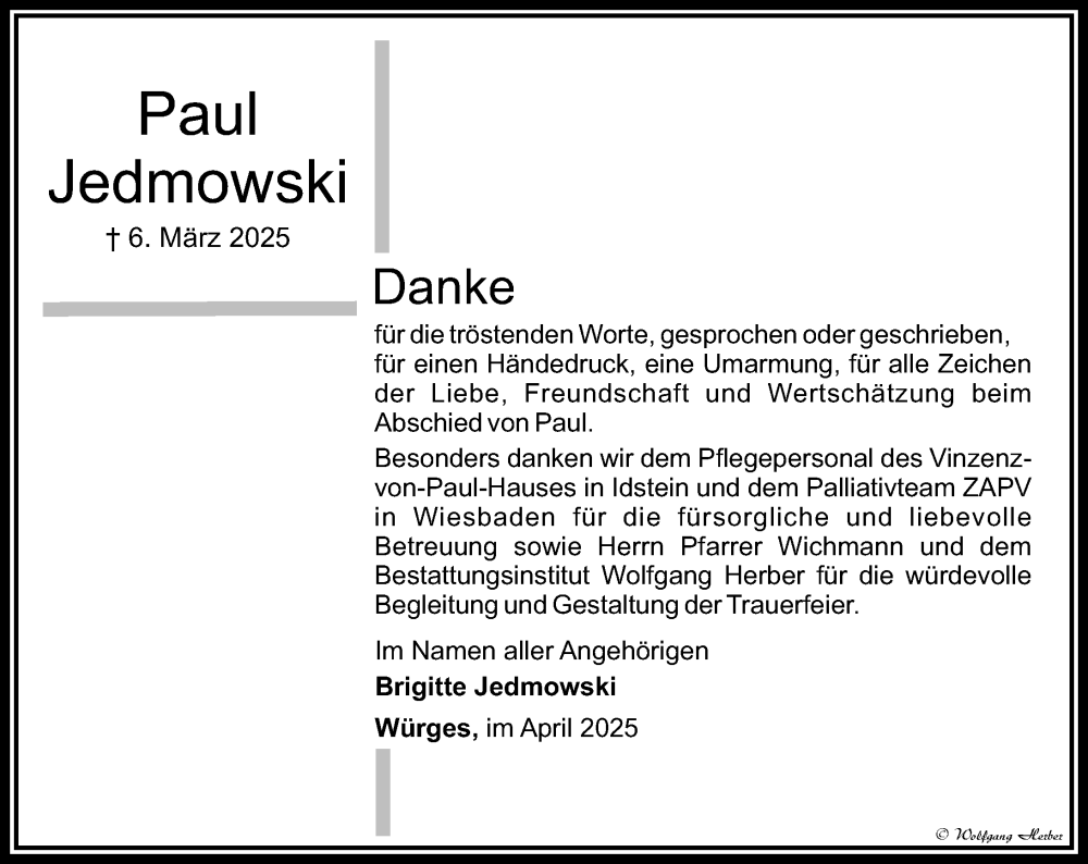 Hier finden Sie alle Traueranzeigen aus der Zeitung, die bisher für Paul Jedmowski erschienen sind. Weitere Traueranzeigen, die in der Zeitung erscheinen, werden hier ebenfalls aufgelistet