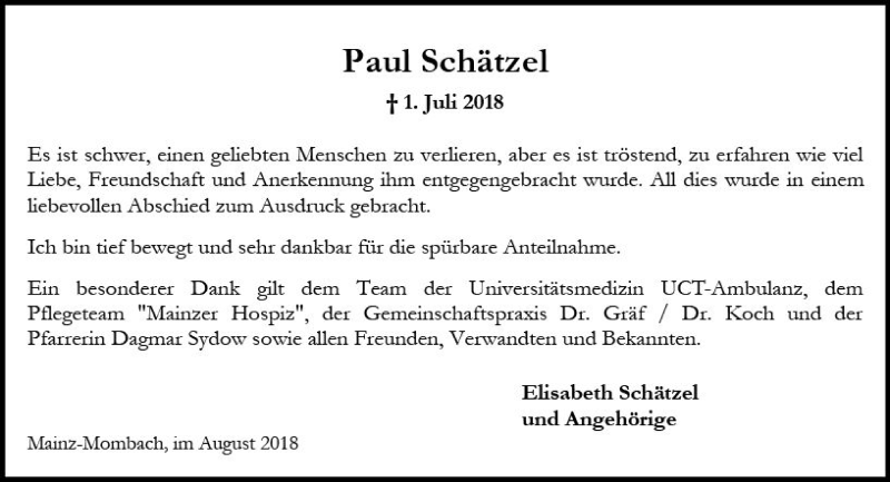 Hier finden Sie alle Traueranzeigen aus der Zeitung, die bisher für Paul Schätzel erschienen sind. Weitere Traueranzeigen, die in der Zeitung erscheinen, werden hier ebenfalls aufgelistet
