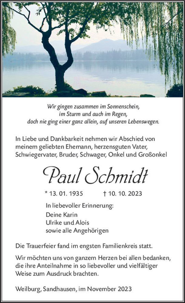 Hier finden Sie alle Traueranzeigen aus der Zeitung, die bisher für Paul Schmidt erschienen sind. Weitere Traueranzeigen, die in der Zeitung erscheinen, werden hier ebenfalls aufgelistet
