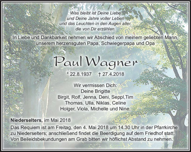 Hier finden Sie alle Traueranzeigen aus der Zeitung, die bisher für Paul Wagner erschienen sind. Weitere Traueranzeigen, die in der Zeitung erscheinen, werden hier ebenfalls aufgelistet
