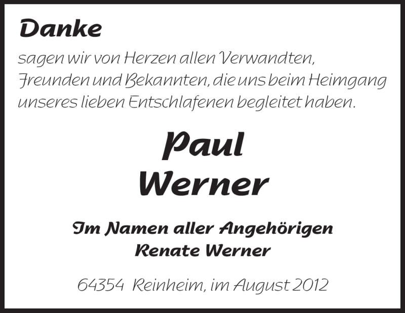 Hier finden Sie alle Traueranzeigen aus der Zeitung, die bisher für Paul Werner erschienen sind. Weitere Traueranzeigen, die in der Zeitung erscheinen, werden hier ebenfalls aufgelistet