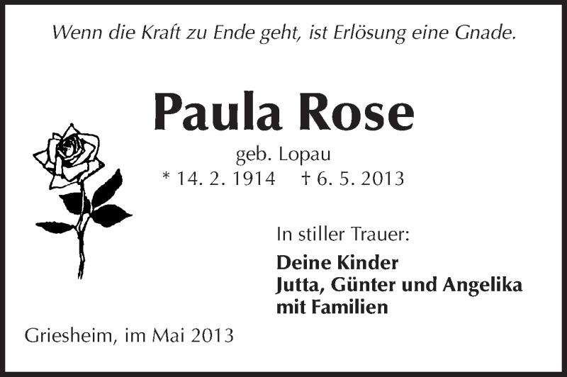 Hier finden Sie alle Traueranzeigen aus der Zeitung, die bisher für Paula Rose erschienen sind. Weitere Traueranzeigen, die in der Zeitung erscheinen, werden hier ebenfalls aufgelistet