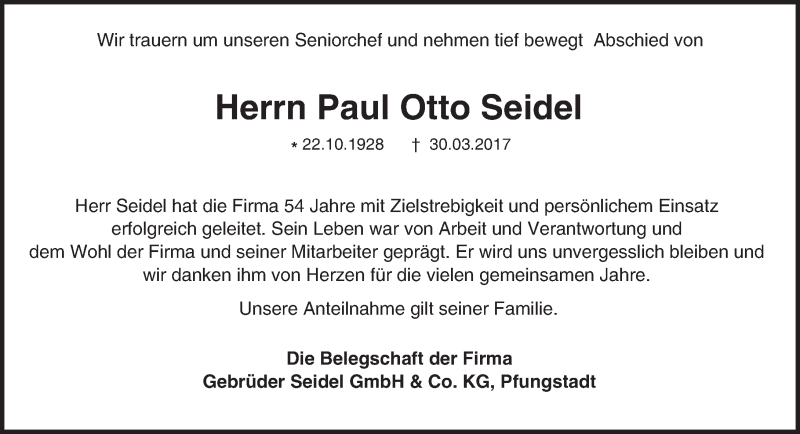 Hier finden Sie alle Traueranzeigen aus der Zeitung, die bisher für Paul Otto Seidel erschienen sind. Weitere Traueranzeigen, die in der Zeitung erscheinen, werden hier ebenfalls aufgelistet