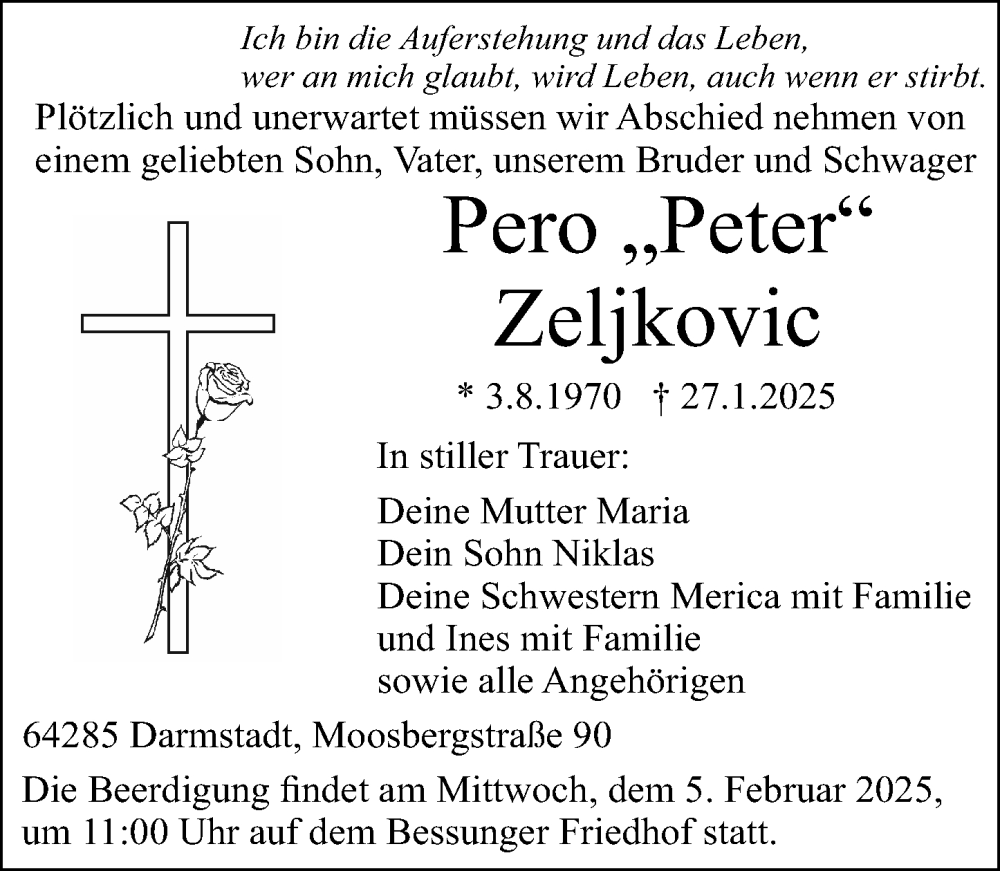Hier finden Sie alle Traueranzeigen aus der Zeitung, die bisher für Pero Zeljkovic erschienen sind. Weitere Traueranzeigen, die in der Zeitung erscheinen, werden hier ebenfalls aufgelistet