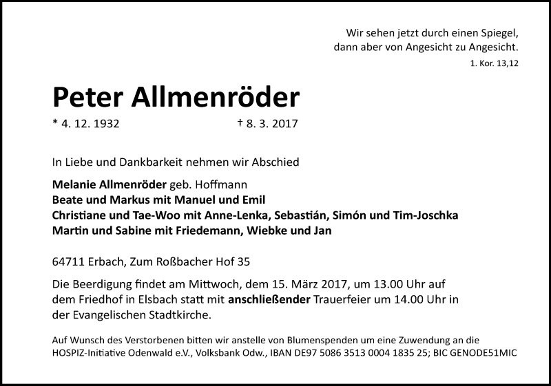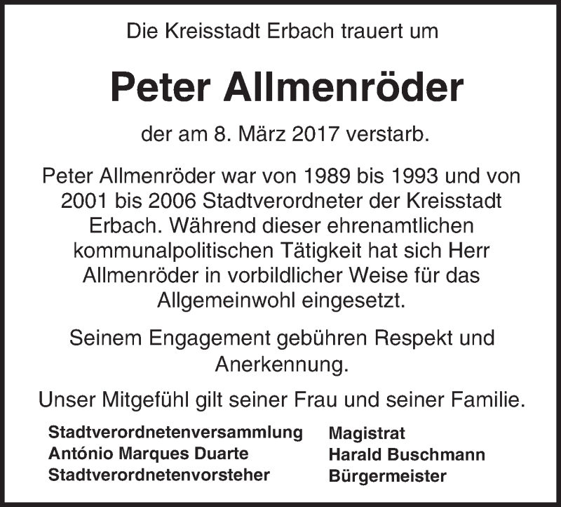 Hier finden Sie alle Traueranzeigen aus der Zeitung, die bisher für Peter Allmenröder erschienen sind. Weitere Traueranzeigen, die in der Zeitung erscheinen, werden hier ebenfalls aufgelistet