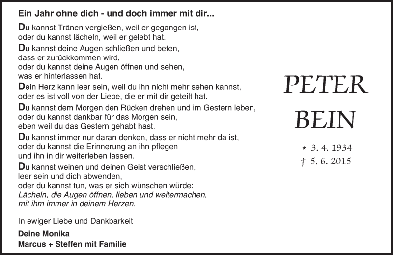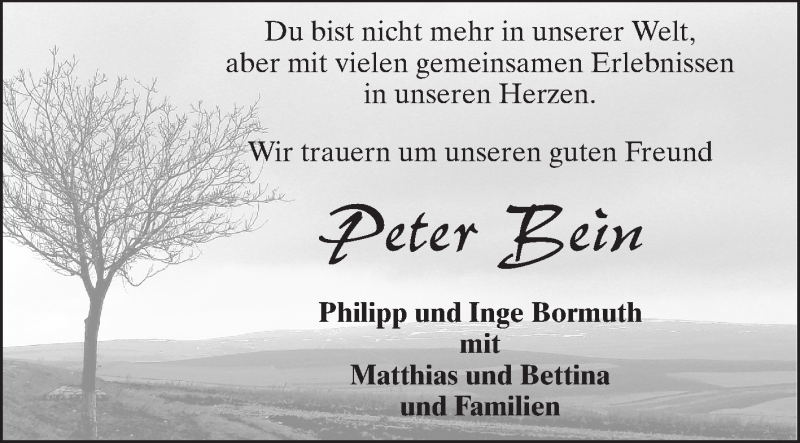 Hier finden Sie alle Traueranzeigen aus der Zeitung, die bisher für Peter Bein erschienen sind. Weitere Traueranzeigen, die in der Zeitung erscheinen, werden hier ebenfalls aufgelistet