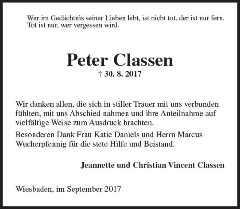 Hier finden Sie alle Traueranzeigen aus der Zeitung, die bisher für Peter Classen erschienen sind. Weitere Traueranzeigen, die in der Zeitung erscheinen, werden hier ebenfalls aufgelistet