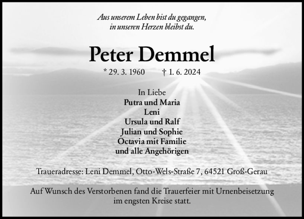 Hier finden Sie alle Traueranzeigen aus der Zeitung, die bisher für Peter Demmel erschienen sind. Weitere Traueranzeigen, die in der Zeitung erscheinen, werden hier ebenfalls aufgelistet