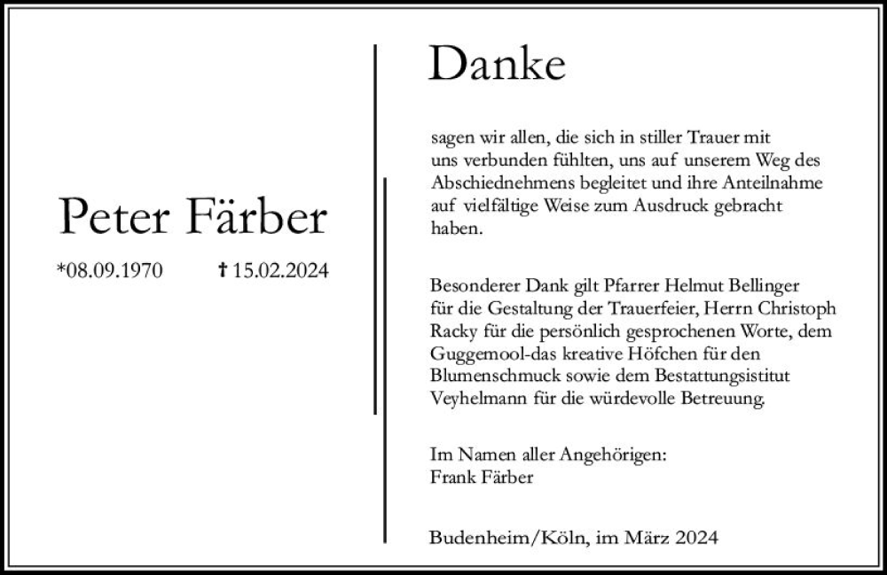 Hier finden Sie alle Traueranzeigen aus der Zeitung, die bisher für Peter Färber erschienen sind. Weitere Traueranzeigen, die in der Zeitung erscheinen, werden hier ebenfalls aufgelistet