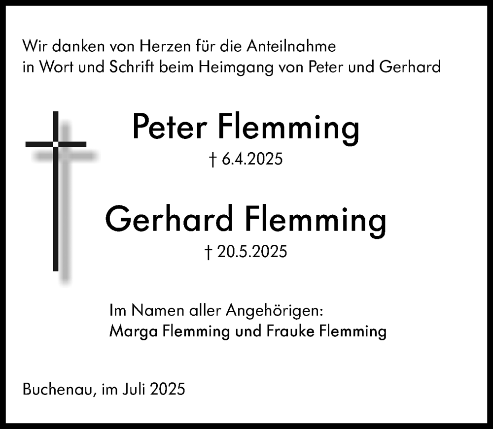 Hier finden Sie alle Traueranzeigen aus der Zeitung, die bisher für Peter Flemming erschienen sind. Weitere Traueranzeigen, die in der Zeitung erscheinen, werden hier ebenfalls aufgelistet