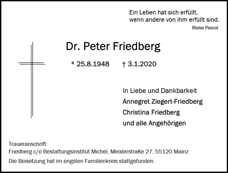 Hier finden Sie alle Traueranzeigen aus der Zeitung, die bisher für Peter Friedberg erschienen sind. Weitere Traueranzeigen, die in der Zeitung erscheinen, werden hier ebenfalls aufgelistet