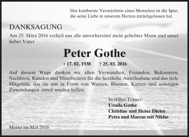 Hier finden Sie alle Traueranzeigen aus der Zeitung, die bisher für Peter Gothe erschienen sind. Weitere Traueranzeigen, die in der Zeitung erscheinen, werden hier ebenfalls aufgelistet