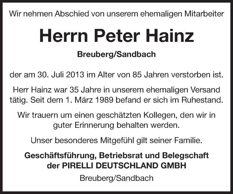 Hier finden Sie alle Traueranzeigen aus der Zeitung, die bisher für Peter Hainz erschienen sind. Weitere Traueranzeigen, die in der Zeitung erscheinen, werden hier ebenfalls aufgelistet