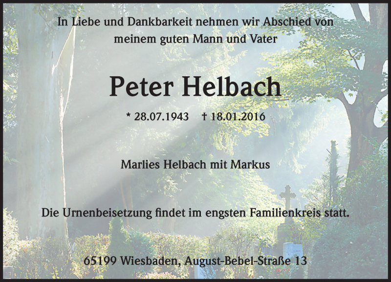 Hier finden Sie alle Traueranzeigen aus der Zeitung, die bisher für Peter Helbach erschienen sind. Weitere Traueranzeigen, die in der Zeitung erscheinen, werden hier ebenfalls aufgelistet