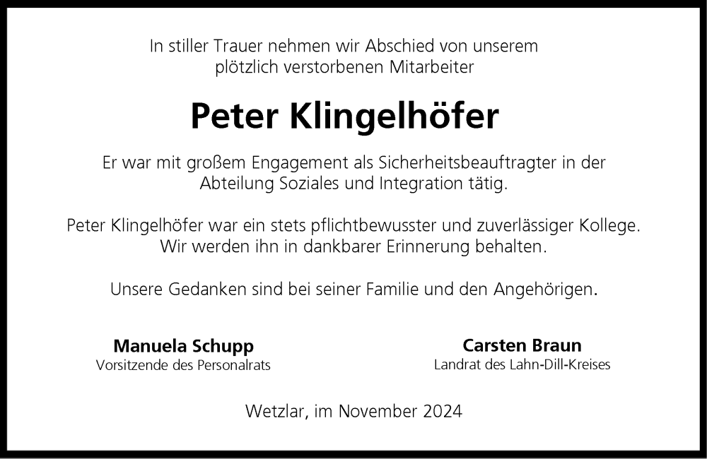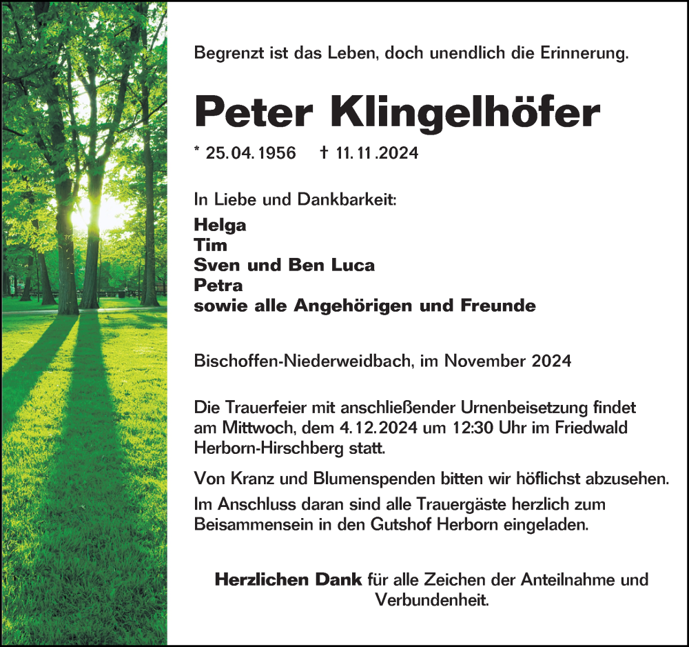 Hier finden Sie alle Traueranzeigen aus der Zeitung, die bisher für Peter Klingelhöfer erschienen sind. Weitere Traueranzeigen, die in der Zeitung erscheinen, werden hier ebenfalls aufgelistet