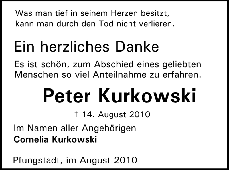 Hier finden Sie alle Traueranzeigen aus der Zeitung, die bisher für Peter Kurkowski erschienen sind. Weitere Traueranzeigen, die in der Zeitung erscheinen, werden hier ebenfalls aufgelistet