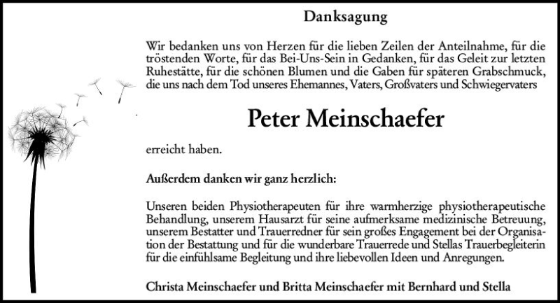 Hier finden Sie alle Traueranzeigen aus der Zeitung, die bisher für Peter Meinschaefer erschienen sind. Weitere Traueranzeigen, die in der Zeitung erscheinen, werden hier ebenfalls aufgelistet