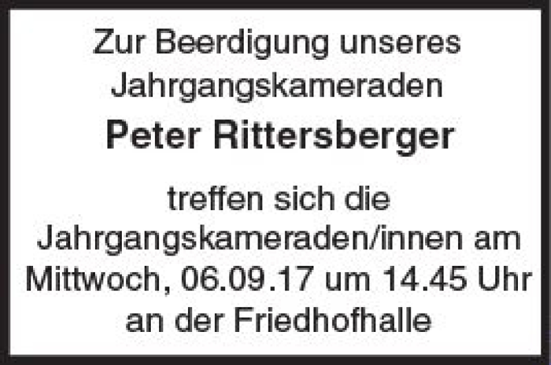 Hier finden Sie alle Traueranzeigen aus der Zeitung, die bisher für Peter Rittersberger erschienen sind. Weitere Traueranzeigen, die in der Zeitung erscheinen, werden hier ebenfalls aufgelistet