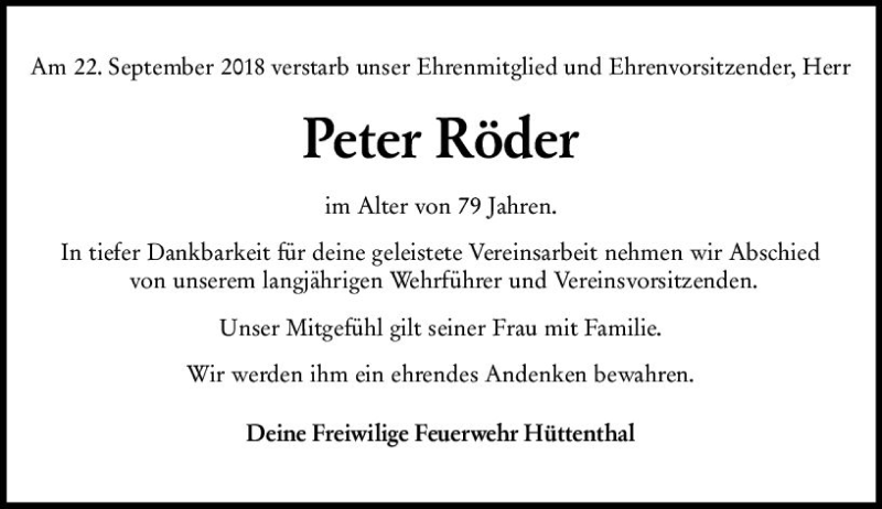 Hier finden Sie alle Traueranzeigen aus der Zeitung, die bisher für Peter Röder erschienen sind. Weitere Traueranzeigen, die in der Zeitung erscheinen, werden hier ebenfalls aufgelistet