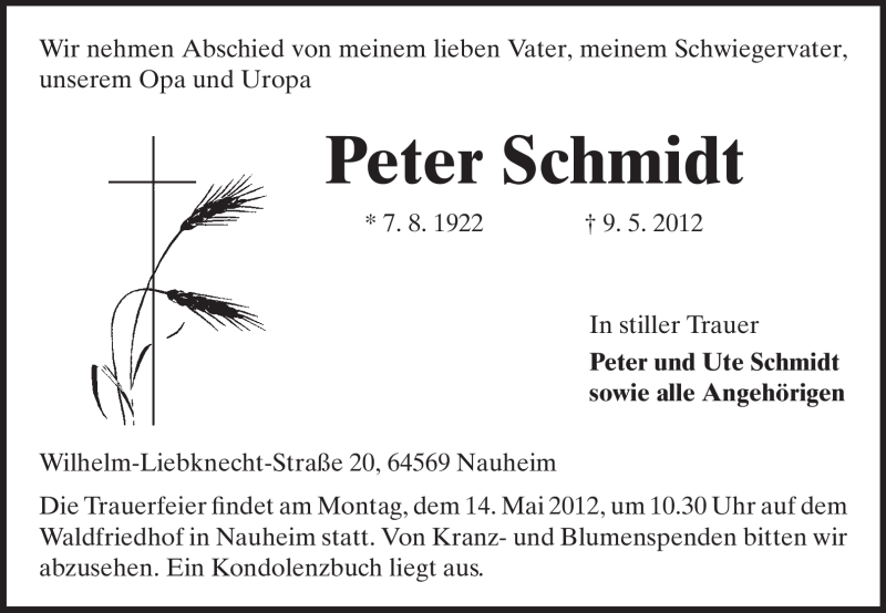 Hier finden Sie alle Traueranzeigen aus der Zeitung, die bisher für Peter Schmidt erschienen sind. Weitere Traueranzeigen, die in der Zeitung erscheinen, werden hier ebenfalls aufgelistet