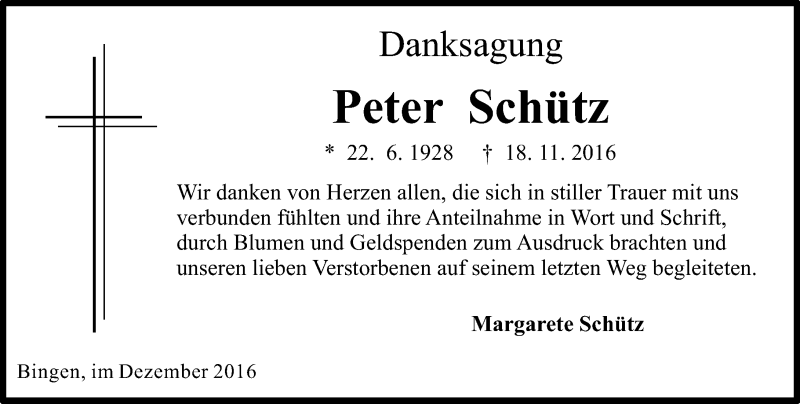 Hier finden Sie alle Traueranzeigen aus der Zeitung, die bisher für Peter Schütz erschienen sind. Weitere Traueranzeigen, die in der Zeitung erscheinen, werden hier ebenfalls aufgelistet