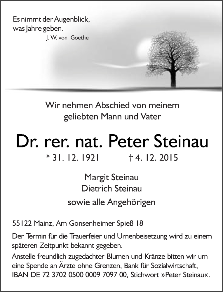 Hier finden Sie alle Traueranzeigen aus der Zeitung, die bisher für Peter Steinau erschienen sind. Weitere Traueranzeigen, die in der Zeitung erscheinen, werden hier ebenfalls aufgelistet