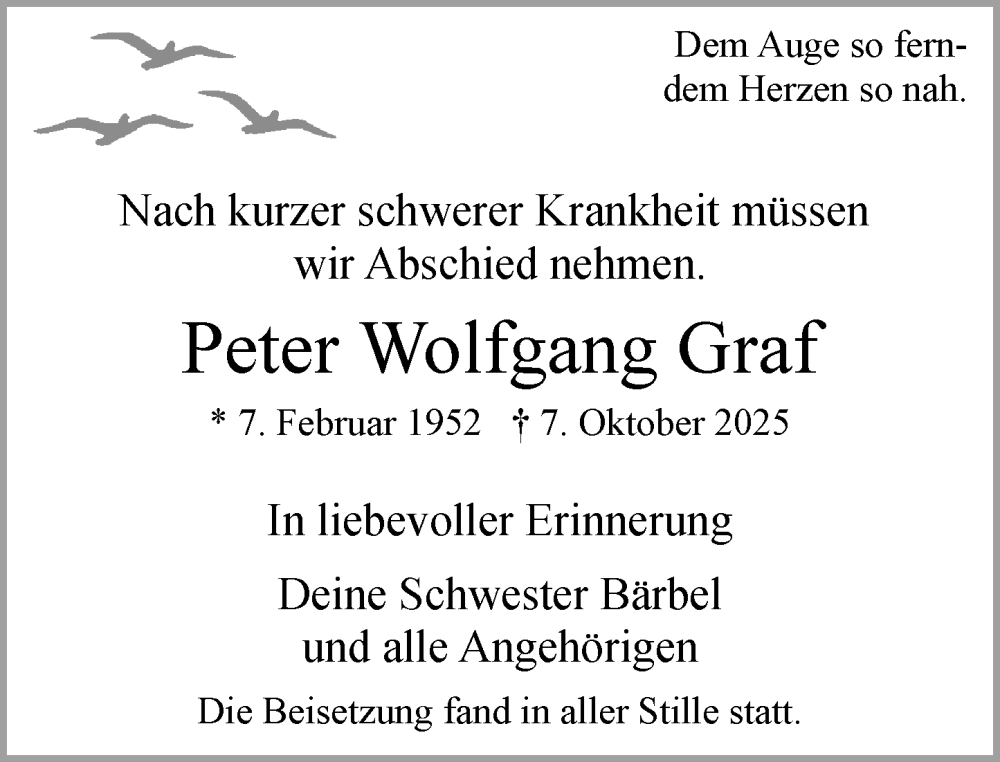 Hier finden Sie alle Traueranzeigen aus der Zeitung, die bisher für Peter Wolfgang Graf erschienen sind. Weitere Traueranzeigen, die in der Zeitung erscheinen, werden hier ebenfalls aufgelistet