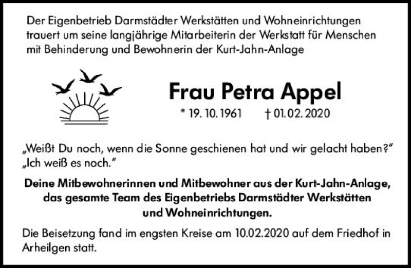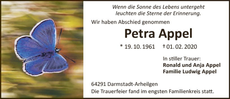 Hier finden Sie alle Traueranzeigen aus der Zeitung, die bisher für Petra Appel erschienen sind. Weitere Traueranzeigen, die in der Zeitung erscheinen, werden hier ebenfalls aufgelistet