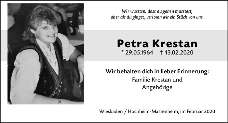 Hier finden Sie alle Traueranzeigen aus der Zeitung, die bisher für Petra Krestan erschienen sind. Weitere Traueranzeigen, die in der Zeitung erscheinen, werden hier ebenfalls aufgelistet