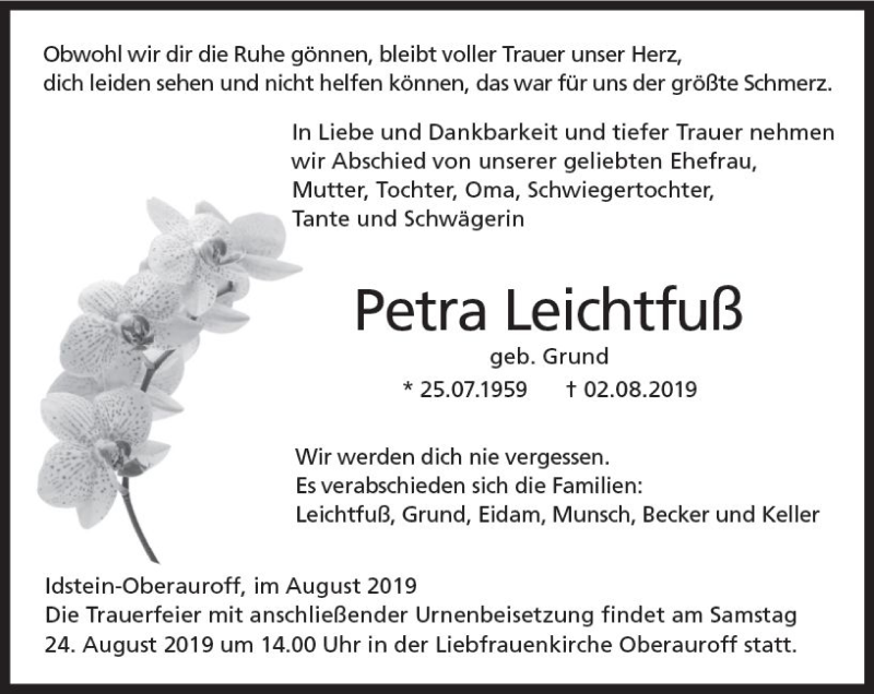 Hier finden Sie alle Traueranzeigen aus der Zeitung, die bisher für Petra Leichtfuß erschienen sind. Weitere Traueranzeigen, die in der Zeitung erscheinen, werden hier ebenfalls aufgelistet