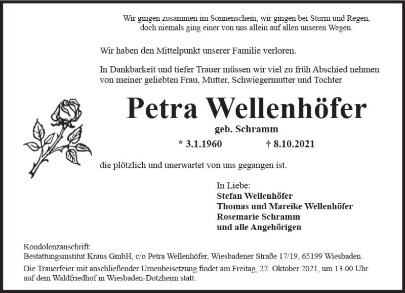 Hier finden Sie alle Traueranzeigen aus der Zeitung, die bisher für Petra Wellenhöfer erschienen sind. Weitere Traueranzeigen, die in der Zeitung erscheinen, werden hier ebenfalls aufgelistet