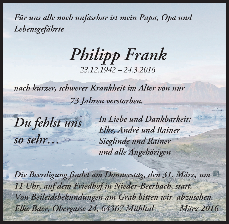 Hier finden Sie alle Traueranzeigen aus der Zeitung, die bisher für Philipp Frank erschienen sind. Weitere Traueranzeigen, die in der Zeitung erscheinen, werden hier ebenfalls aufgelistet