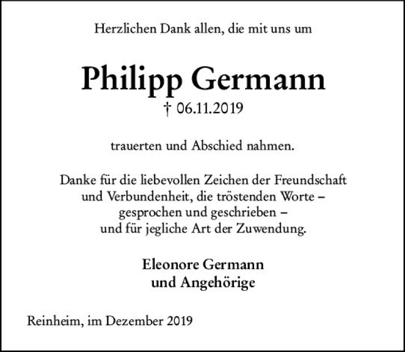 Hier finden Sie alle Traueranzeigen aus der Zeitung, die bisher für Philipp Germann erschienen sind. Weitere Traueranzeigen, die in der Zeitung erscheinen, werden hier ebenfalls aufgelistet