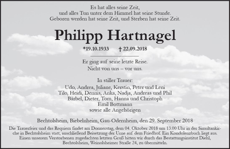 Hier finden Sie alle Traueranzeigen aus der Zeitung, die bisher für Philipp Hartnagel erschienen sind. Weitere Traueranzeigen, die in der Zeitung erscheinen, werden hier ebenfalls aufgelistet