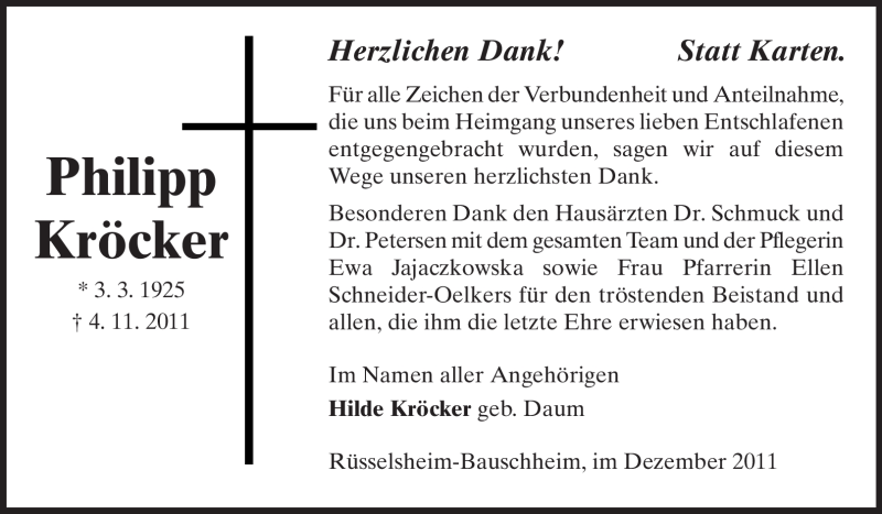 Hier finden Sie alle Traueranzeigen aus der Zeitung, die bisher für Philipp Kröcker erschienen sind. Weitere Traueranzeigen, die in der Zeitung erscheinen, werden hier ebenfalls aufgelistet