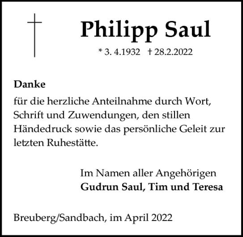 Hier finden Sie alle Traueranzeigen aus der Zeitung, die bisher für Philipp Saul erschienen sind. Weitere Traueranzeigen, die in der Zeitung erscheinen, werden hier ebenfalls aufgelistet