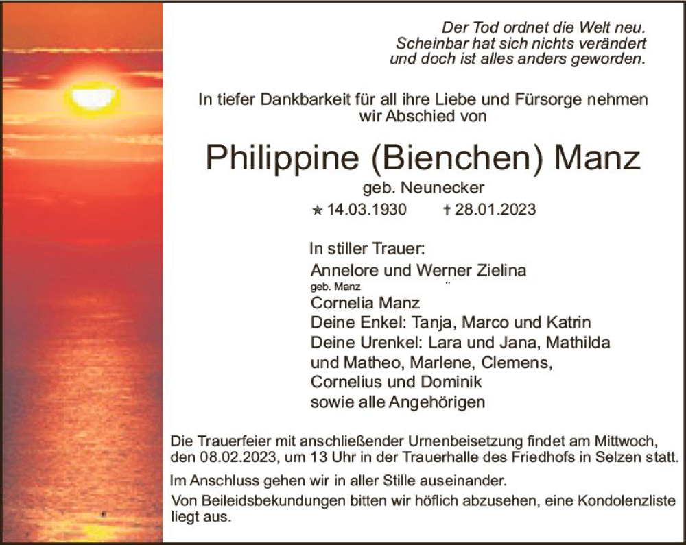 Hier finden Sie alle Traueranzeigen aus der Zeitung, die bisher für Philippine Manz erschienen sind. Weitere Traueranzeigen, die in der Zeitung erscheinen, werden hier ebenfalls aufgelistet